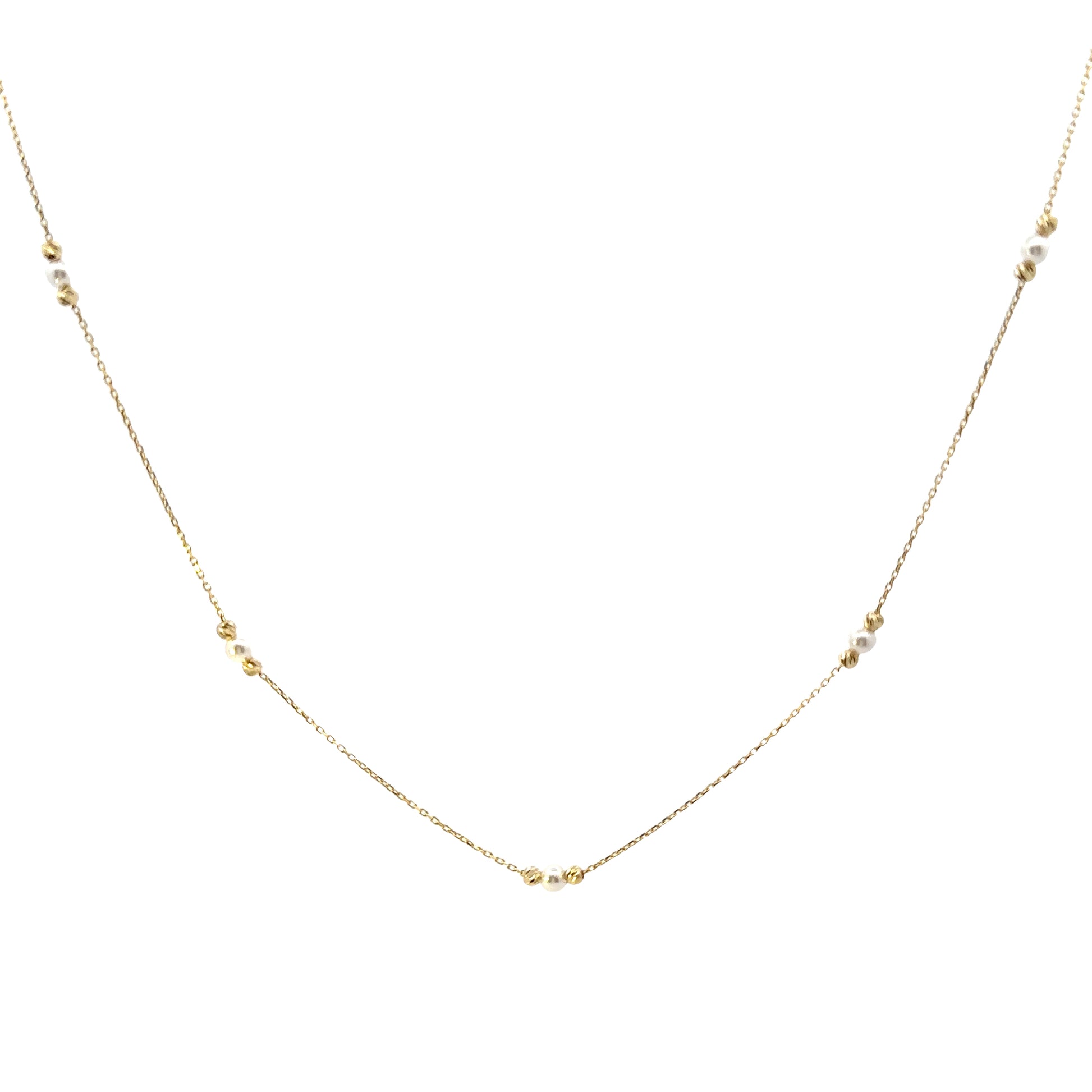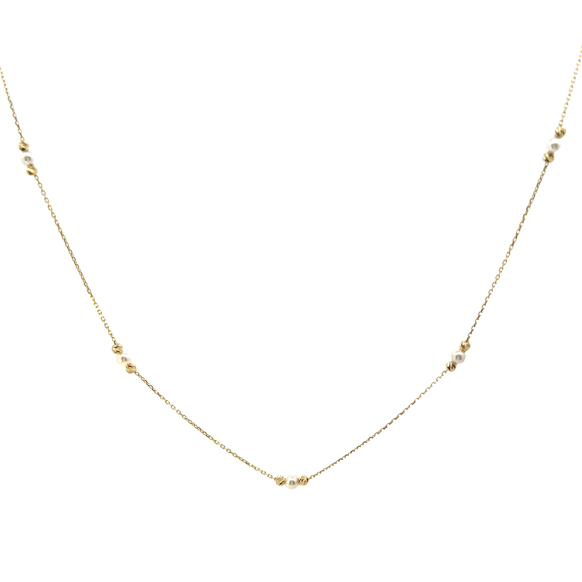 Embrace classic elegance with our 14 karat gold pearl beads station necklace. Each lustrous pearl exudes timeless beauty, creating a sophisticated accessory that adds refinement to any look.
